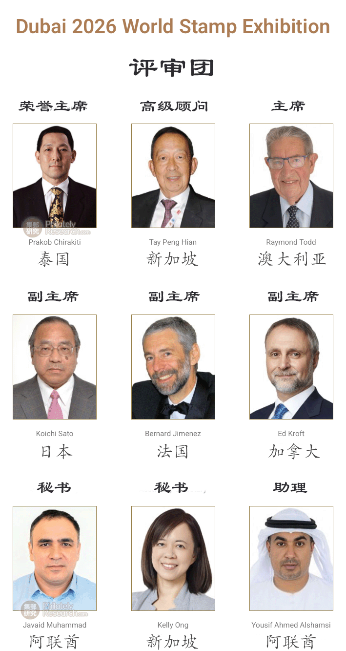 阿联酋定于2026年2月4日至2月8日在迪拜举办专项世界邮展,此次世界邮展纪念阿联酋集邮联合会成立30周年,FIP国际集邮联合会成立100周年,展览设非竞赛单元和8个竞赛类别包括:传统、邮政史、邮政用品、专题、图画明信片、一框、青少年和集邮文献,12月上旬公布了展品目录,12月底公布评审团名单,中国选送王志刚、寇磊担任此次邮展国际评审,评审团主席由澳大利亚雷蒙德·托德担任,普拉科担任荣誉主席,郑炳贤担任高级顾问,亚洲、欧洲、美洲分别选派一位副主席,集邮圈小程序曾介绍此次邮展中国选派22部展品参展,包括邮集19部(邮政史5部,邮政用品2部,专题6部,图画明信片1部,青少年4部,文献3种),丁劲松的《中国海关邮政史(1866-1897)》,张兰青的《华邮之王 —— 红印花小一元流传考》集邮文献,张巍巍的《烦人的虱子》图画明信片,李汇祥的《芬兰带环形标志的邮政用品(1891~1911)》,李宏的《巴拉圭邮政用品(1881-1928)》,李少可的《路:从古走到今直至未来》专题,王跃的《四川邮政史(1891-1921)》,祝业平《中华人民共和国航空邮票》等一批有竞争力的展品齐集迪拜,既有对历史尘埃的细致梳理,也有对科学文化的生动演绎,更不乏现代生活的创意表达。它们如同一扇扇窗口,不仅展示了中国集邮家丰厚的收藏与精湛的研究水平,更向世界传递了中国人广阔的知识兴趣与深厚的文化情怀,成为国际邮展上一道亮丽而厚重的风景线。