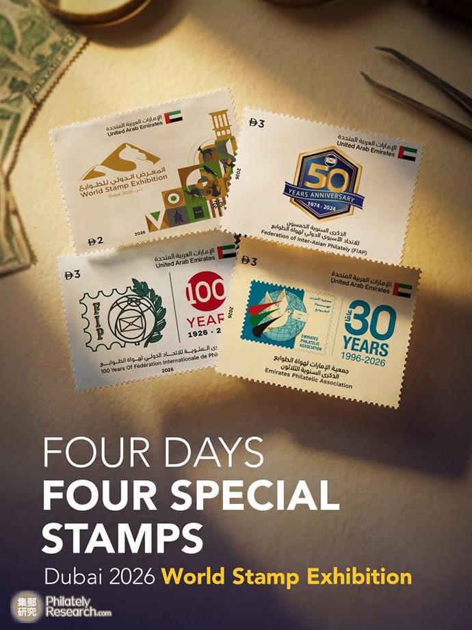 2月4日当地时间中午时间11点北京时间下午15点,迪拜2026专项世界邮展DUBAI 2026在阿联酋迪拜世贸中心谢赫·马克图姆大厅举行,邮展持续到2月8日,此次展览不仅是阿拉伯地区及西亚首次举办的世界级集邮盛会,也恰逢阿联酋集邮协会成立30周年暨国际集邮联合会成立百年庆典,进一步巩固了阿联酋在国际专业展览全球日程中的重要地位。阿联酋邮政配合邮展发行邮展纪念邮票小全张1枚含3枚,同时发行国际集邮联成立100周年、阿联酋集邮协会成立30周年和亚洲集邮联成立50周年邮票(详见附图)。中国选派谷泽伟、王雅玏担任征集员,选派王志刚、寇磊担任此次邮展国际评审,此次邮展中国选派22部展品参展,包括邮集19部(邮政史5部,邮政用品2部,专题6部,图画明信片1部,青少年4部,文献3种)。