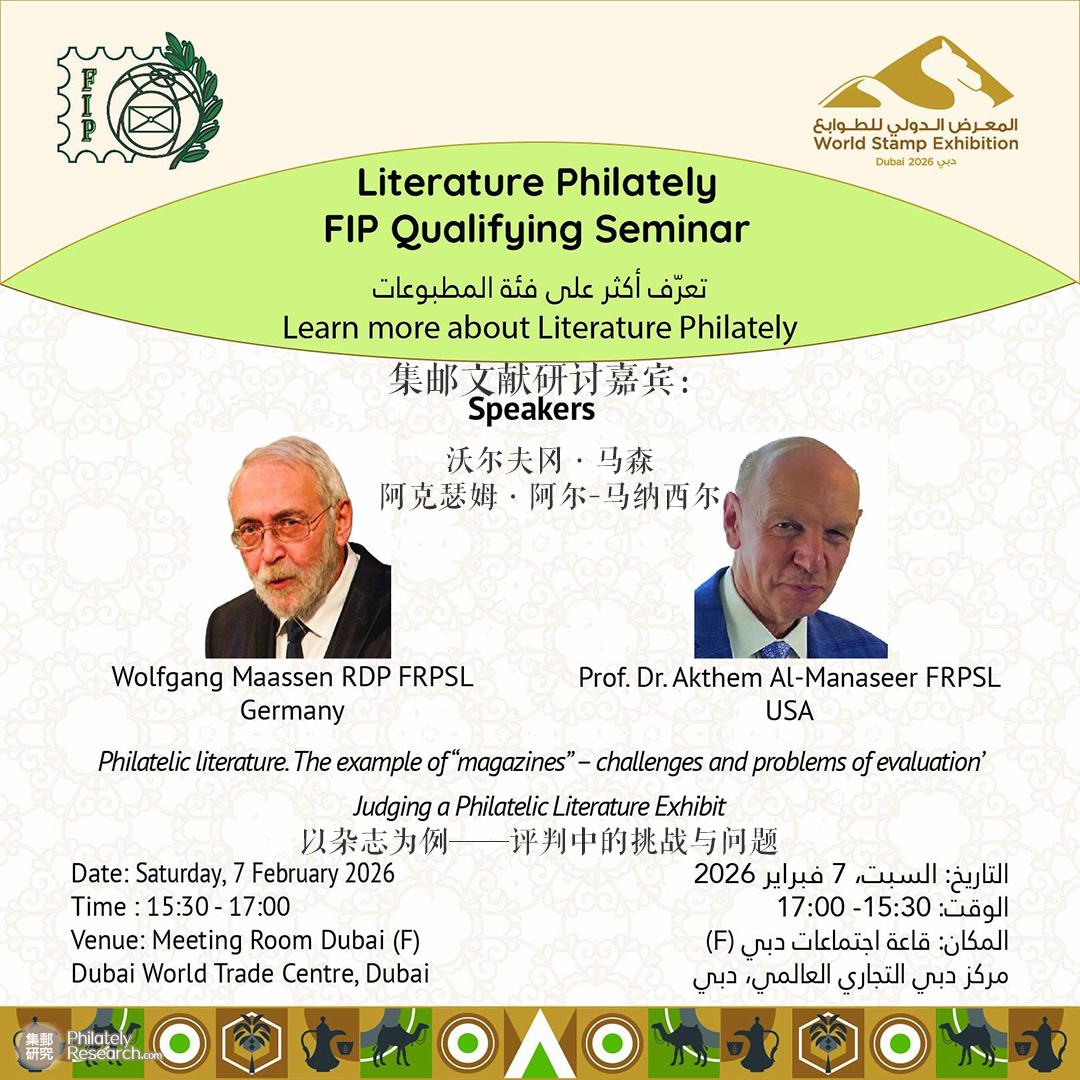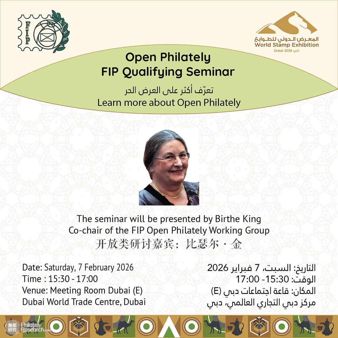 展览汇聚了76个国家的代表,呈现出卓越的国际参与度,为文化交流与专业对话创造了宝贵契机,彰显其在加强全球集邮爱好者间纽带的重要作用。联合国邮政管理处及万国邮政联盟共同参与展会,其中万国邮政联盟专门主持了邮政管理部门专项竞赛。展览还集中呈现了来自世界各地的数千枚珍稀邮票。2026年2月7日,迪拜2027专项世界邮展举办三个类别的研讨会,包括文献、开放和首日封,FIP首日封专题研讨会由伊格尔·纳撒尼尔、科林·弗雷泽、约翰·霍奇纳等多位FIP邀请的国际集邮专家领衔,围绕首日封这一热门收藏领域的演变、FIP实验类别建立、收藏展览组集经验及专业评审标准等核心议题展开了深度探讨。会议特设线上通道,迪拜时间7日中午12:00通过Zoom平台向全球集邮者同步开放,有效促进了国际集邮界的专业交流与知识共享,进一步丰富了迪拜2026世界邮展的学术内涵。