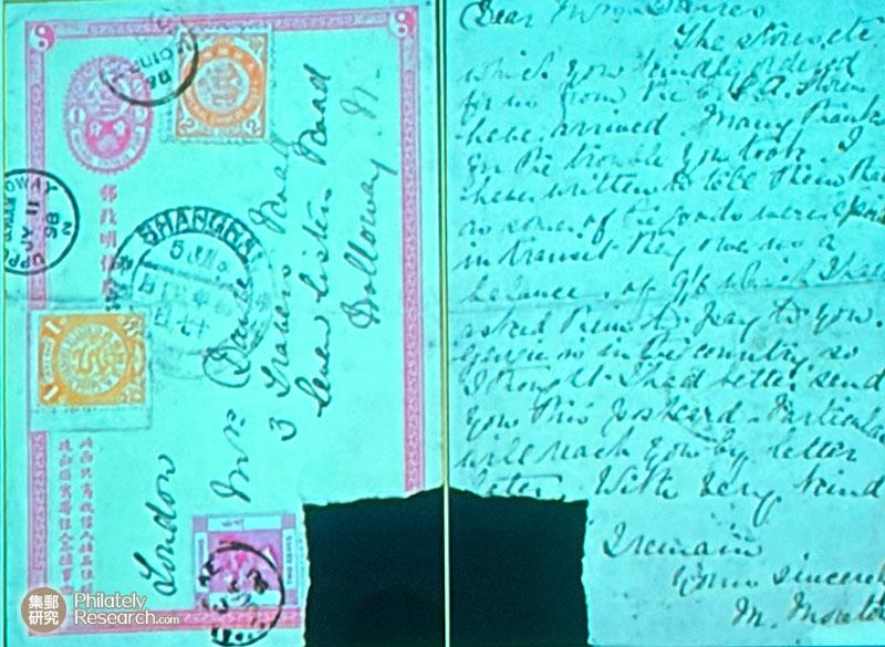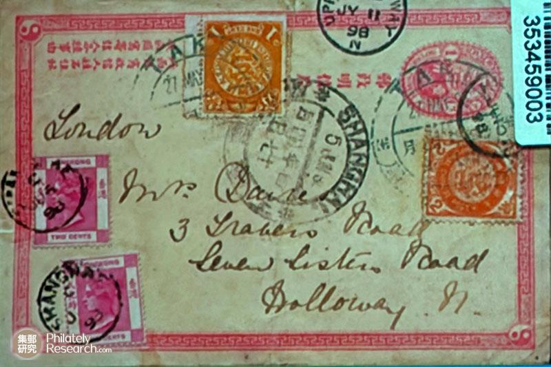 结论:原件为1898年北京始发、经由上海寄英国的残片(明信片一角及一枚香港2仙邮票被撕去),原销盖北京大圆戳的若干枚大清邮票亦脱落。作伪者将备用的大清一次片一角剪下,嫁接红色花饰边框于残片上作修补,贴一枚香港2仙邮票压在拼接处以遮掩,分别补销伪假大沽大圆戳、香港日戳,将原残片变造成珍罕的大沽寄外洋邮资片。